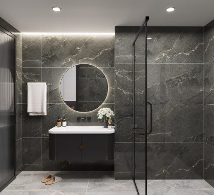 Gạch vân đá mang lại cảm giác tự nhiên, thanh lịch và rất được ưa chuộng trong thiết kế phòng tắm cao cấp. Bạn có thể chọn gạch vân đá marble sáng màu để tạo sự sang trọng hoặc gạch vân đá tối màu để tăng chiều sâu và sự ấm cúng.